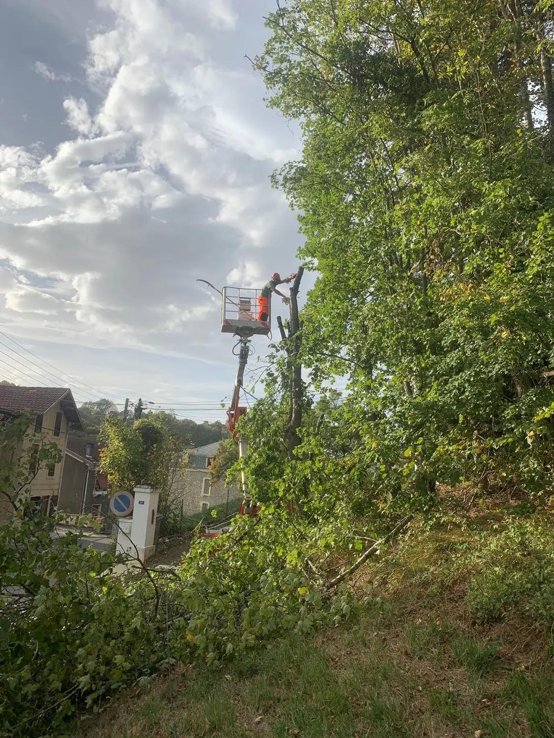 Lors de cette intervention, il a été réalisé pour une entreprise l’abattage de qautre arbres pour la sécurité précédente tempête, une partie d’un arbre est tombée pas très loin d’un jeune homme, le voisin a donc demandé un élagage d'arbres : j’ai donc abattu 4 arbres pour cette intervention, j’ai choisi un élagage avec nacelle comme vous pouvez le voir sur la photo.