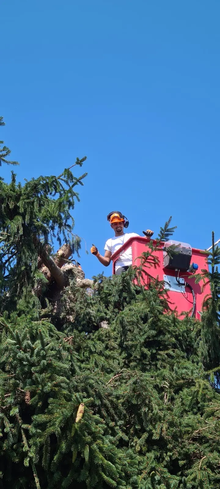 Grosse diminution d’un sapin lors de l'élagage. La circonférence de certaines branches ont nécessité l'intervention de la nacelle et l'évacuation de déchets verts. Plusieurs arbres ont été élagués sur ce même chantier.